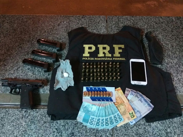 No interior do veículo foi encontrado uma pistola da marca Taurus (brasil), calibre .380 e numeração kvc83882, dentro de um coldre em sua cintura; 3 carregadores calibre .380 municiados; 60 munições calibre .380; uma pedra de substância análoga a cocaína, encontrada no bolso da vítima; 1 celular ; 2 toucas ninja, 1 coldre; 1 porta carregador; uma carteira com anotações e R$ 881 em espécie.