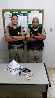 Conforme informações, os militares, Sargento Alexandre e Soldado Guilherme (foto ao lado), visualizaram o suspeito, (que ja é conhecido no meio policial pela prática de tráfico de drogas), próximo a sua residência, momento em que ao avistar a viatura, o menor saiu correndo para o interior da casa. No entanto, os policiais conseguiram entrar na residência, com autorização do pai do rapaz. Após buscas, foi localizado dentro da residência, uma pequena porção de maconha, um celular, dois cordões de inox, R$ 60 em dinheiro e dentro de um recipiente de vidro, em cima do armário da cozinha, um revólver calibre .32 municiado com três cartuchos em bom estado de conservação e funcionamento.